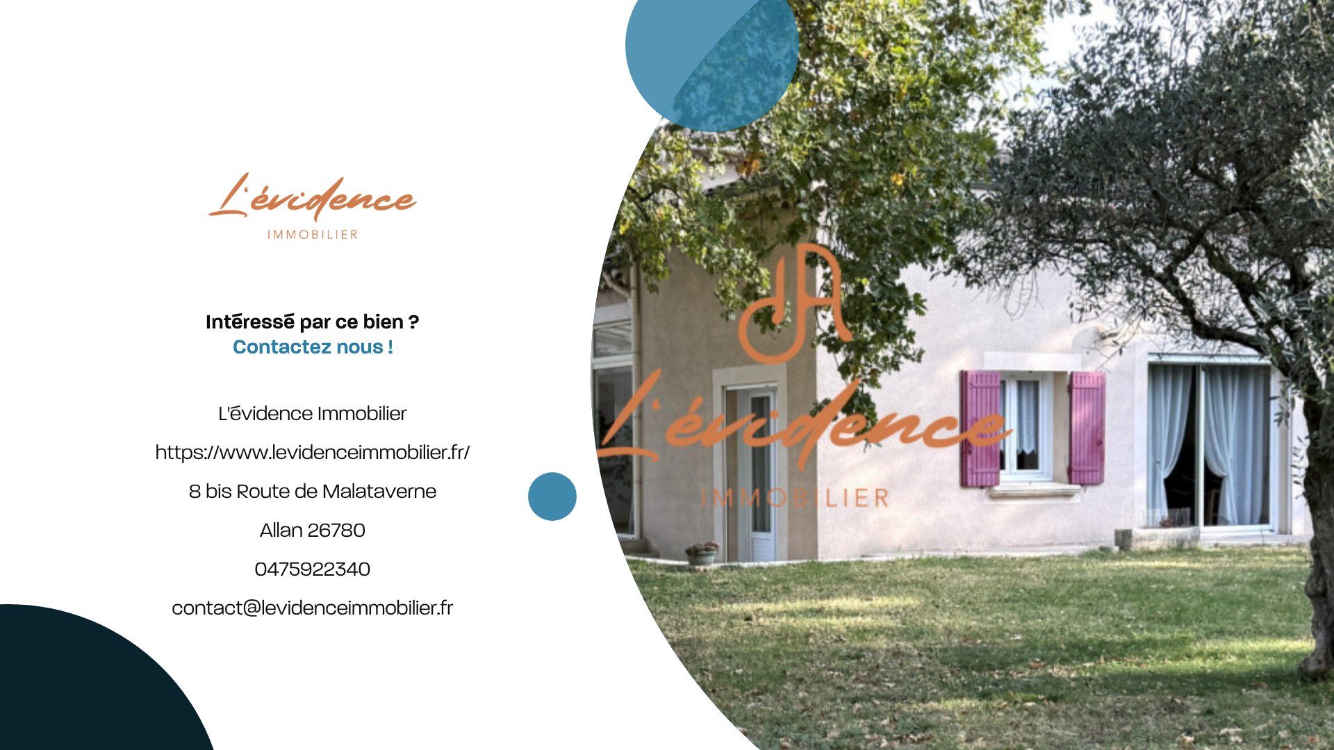 suppression et sont destinées à : L'évidence Immobilier. Conformément